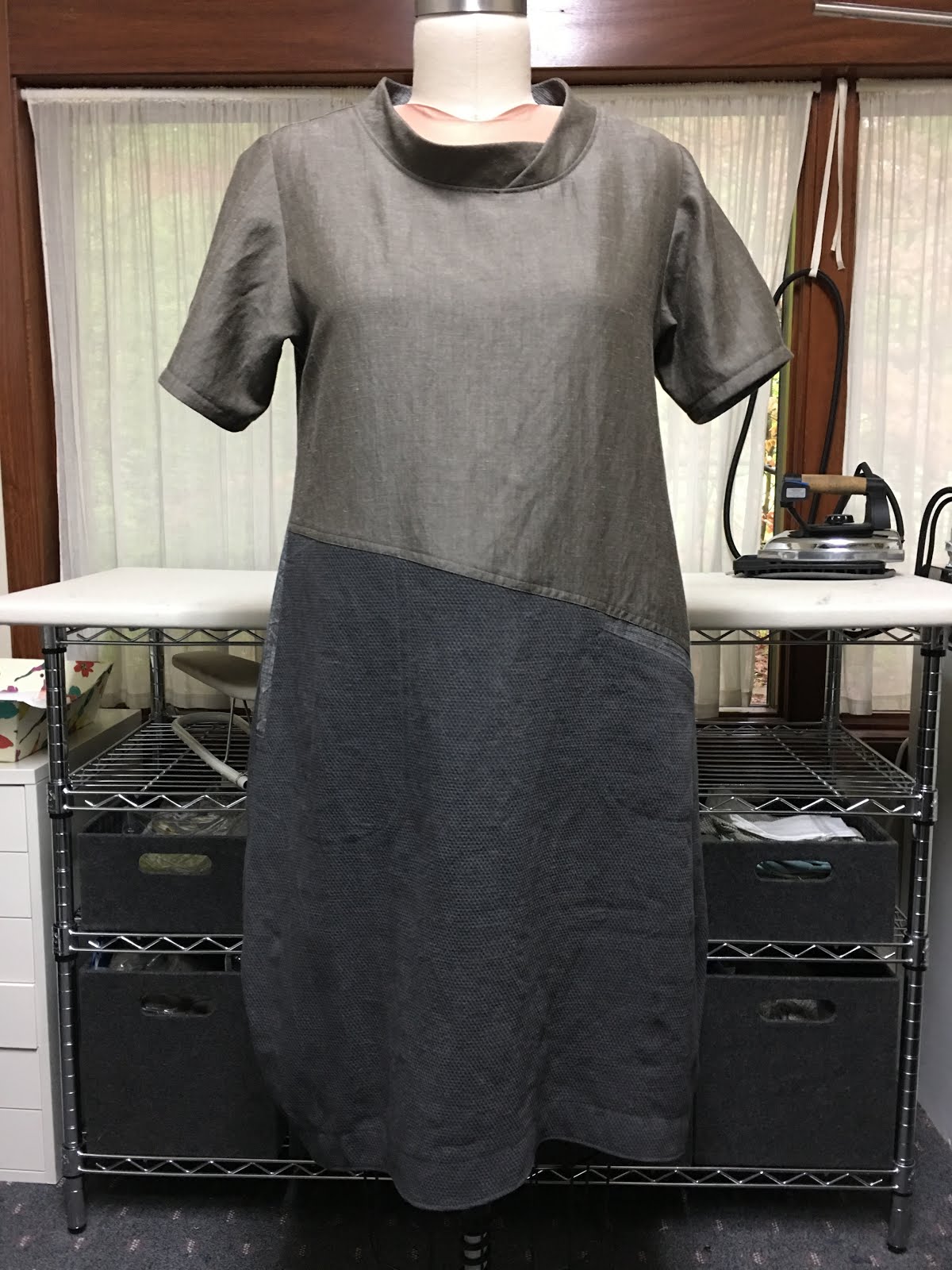 I started with my woven T-shirt pattern. I have been using and tweaking this pattern for years (possibly as long as the Eileen Fisher linen has been aging!) It is a great place to start and I know I will be happy with the fit. I lengthened it, added the 'must-have' pockets, draped a funky, asymmetrical collar, played around with the hems and decided one linen just wasn't enough...and there you have it...my 'no touch' summer linen dress.